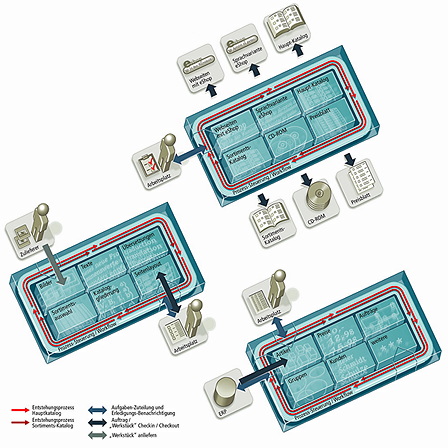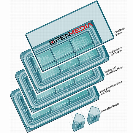 Im zweiten Schritt wird das virtuelle Gerät in seine Bestandteile zerlegt. Die Engine setzt sich aus drei Schichten zusammen, die den Workflow der Katalogherstellung von der Planung bis zur Produktion struktuieren. Allen Ebenen liegt der gleiche, übersichtliche Aufbau zugrunde. Dazu kommen Arbeitsplatz-Module, Ports nach Bedarf aufgesteckt werden können und alle entsprechenden Zugriffsrechte und Möglichkeiten enthalten.