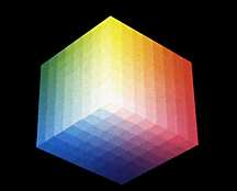 Dreht man den RGB-Würfel so, daß man entlang der Grauachse auf die weiße Spitze sieht, ist die darin enthaltene Farbordnung von Maxwell zu erkennen, hier allerdings als Sechseck angeordnet. Nach innen zur Grauachse hin werden die Farben vergraut, zum Be-trachter hin werden sie heller, von ihm weg dunkler. Die Drehung macht den Aufbau und die Logik der Farbanordnung innerhalb des Würfels sichtbar.