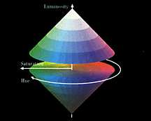 Auf einem solchen Farbsystem, das auf den Arbeiten von Ostwald (1917) beruhte, baute die Firma Tektronix ihr "HLS"-System auf. Im Gegensatz zu der wissenschaftlichen Idee Ostwalds Iieß sich der so geschaffene Programmcode von Tektronix patentrechtlich schützen, was eine allgemeine Verbreitung verhinderte. Niemand traute sich so recht, die fast identischen Farbmodelle von Plochere (1948), Ridgeway (1912) oder Wundt (1874) für sich zu entdecken und eine entsprechende Umsetzung auf dem Computer zu verwirklichen. Im HLS-System liegen alle Vollfarben (Hues) auf einem Farbkreis. Zur Mitte hin nimmt die Farbsättigung (Saturation) ab, die Farbe wird grauer. Die senkrechte Helligkeitsachse (Lumination) führt durch den Graupunkt gleich weit nach unten wie auch nach oben zu Schwarz und Weiß.
