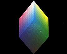Obwohl man mit dem HLS-Farbwahlsystem gut arbeiten kann, ergeben sich dennoch einige Ungereimtheiten. Das liegt vor allem daran, daß verschiedene Grundfarben als unterschiedlich hell empfunden werden. Der senkrecht gekippte RGB-Würfel aus Folge 1 zeigte hier einen möglichen Ausweg, wie ihn beispielsweise die Farbmodelle von Benson( l868) oder Küppers (Farb-Rhomboeder 1972) zeigen. Im Grunde muß nur der Farbkreis, der die Mittelfläche des HLS-Systems bildet, so gefaltet werden, daß die hellen Grundfarben Cyan, Magenta und Yellow höher liegen, die dunklen Grundfarben Rot, Grün und Blau tiefer.