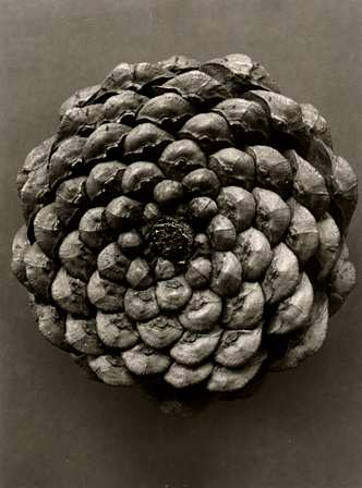 Die Unterseite dieses Zapfens zeigt das gleiche Muster, wie die Simulation. Eine übermäßige Verzerrung der Zapfenblätter wird hier vermieden, indem die Wachstumsspirale in die dritte Dimension ausweicht und sich auf einer zylindrischen Form weiterentwickelt.