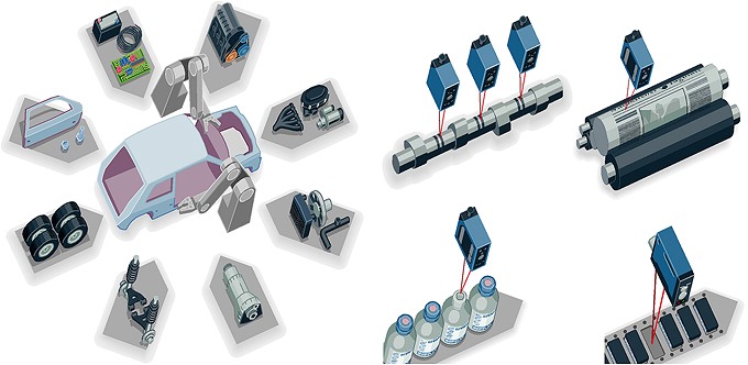 Beispiele für de Einsatz optoelektronischer Sensoren in der Fabrik- und Prozessautomation. Verschiedene Industrie- und Roboter-Anlagen technisch als Schaubild umgesetzt finden Sie auf den 5 folgenden Seiten.