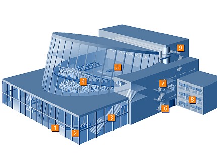 Die Anwendung komplexer Sicherungssysteme sollte anhand fiktiver Bauten gezeigt werden. Die transparente Architektur ermöglicht Einblicke in die unterschiedlichen Gebäudeteile.Schlichter und sachlicher wirkt die illustrative Bauzeichnung als druckreife Umsetzung von Architektenplänen.