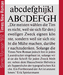 Als "The Times" anbot, eine Anzeigenseite für Monotype kostenlos zu setzen, reagierte Morison: "We'd do much better to pay them a thousand to keep their comps off it!". Die herbe Kritik am Satz der "Times" trug ihm nach einigen zähen Verhandlungen den Auftrag ein, eine besser lesbare Schrift zu beschaffen, die speziell auf den Zeitungsdruck abgestimmt sein sollte. Morison ließ eine Vorlage der Plantin von Victor Lardent entsprechend umzeichnen. Die Times New Roman war geboren.