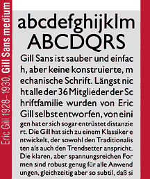 Der Widerspruch zwischen Handwerk und Technisierung, der sein gesamtes Leben prägte, kommt auch in der "Gill Sans" zum Ausdruck, die seine erfolgreichste Schrift wurde. Diese Schrift ist insofern ungewöhnlich, als die serifenlosen Formen und Proportionen denen der Renaissance-Antiqua nachgebildet sind. Aus diesem Grund ist die Gill Sans oft zum lesbarsten serifenlosen Schriftentwurf erklärt worden.