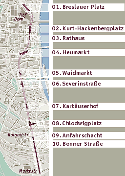 Der Bau des U-Bahn-Tunnels für die Nord-Süd-Stadtbahn führt unter der historischen Altstadt Kölns hindurch. In enger Zusammenarbeit mit Archäologen des Römisch Germanischen Museums werden die nötigen Eingriffe geplant. In übersichtlichen Karten stelle ich die Lage der Trasse in Relation zu den geschichtlichen Stadtplänen.