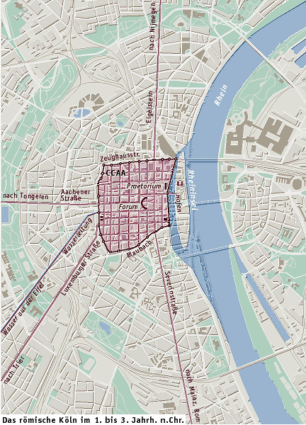Ausdehnung des römischen Köln im 1. bis 3. Jahrh. n. Chr. auf den heutigen Stadtplan projiziert mit dem Verlauf der Nord-Süd-Stadtbahn. Illustration: Uwe Alfer Das römische Köln Köln in spätrömischer Zeit Stadterweiterung 1106 Stadterweiterung 1180 Preußische Festungsstadt Köln heute