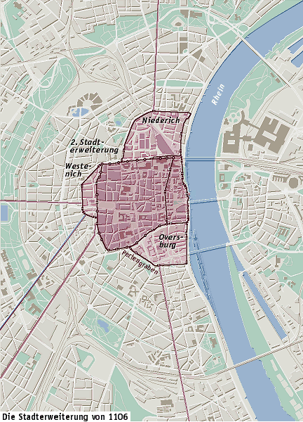 Ausdehnung Kölns nach der erstenStadterweiterung von 1106 auf den heutigen Stadtplan projiziert mit dem Verlauf der Nord-Süd-Stadtbahn. Illustration: Uwe Alfer Das römische Köln Köln in spätrömischer Zeit Stadterweiterung 1106 Stadterweiterung 1180 Preußische Festungsstadt Köln heute