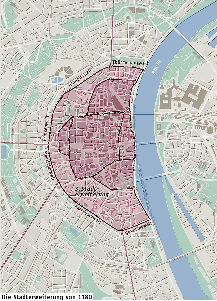 Ausdehnung Kölns nach der zweiten Stadterweiterung von 1180 auf den heutigen Stadtplan projiziert mit dem Verlauf der Nord-Süd-Stadtbahn. Illustration: Uwe Alfer Das römische Köln Köln in spätrömischer Zeit Stadterweiterung 1106 Stadterweiterung 1180 Preußische Festungsstadt Köln heute