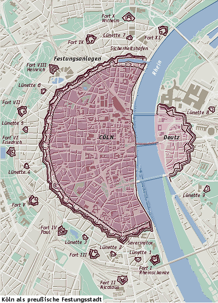 Ausdehnung der preußischen Festungsstadt Köln auf den heutigen Stadtplan projiziert mit dem Verlauf der Nord-Süd-Stadtbahn. Illustration: Uwe Alfer Das römische Köln Köln in spätrömischer Zeit Stadterweiterung 1106 Stadterweiterung 1180 Preußische Festungsstadt Köln heute